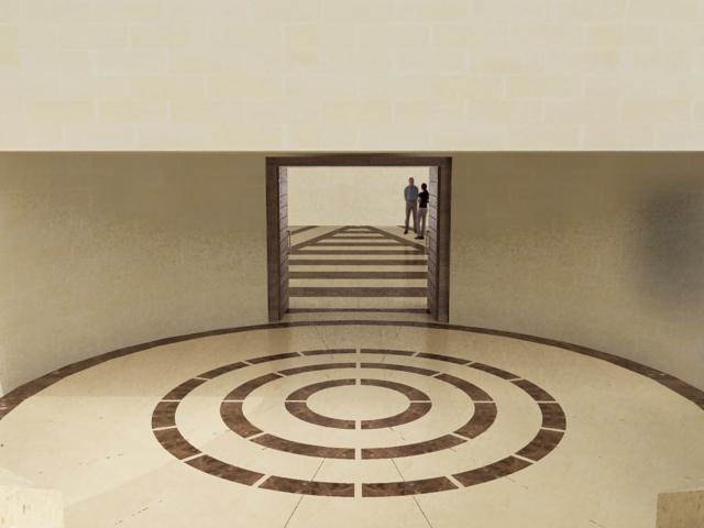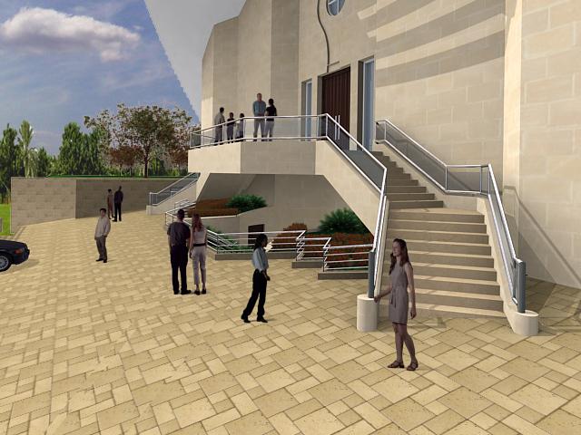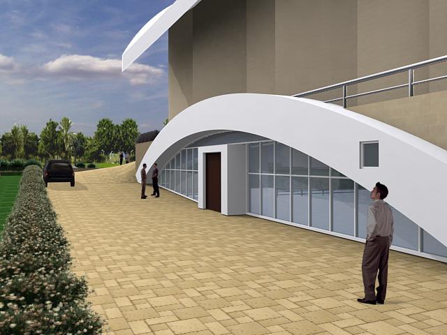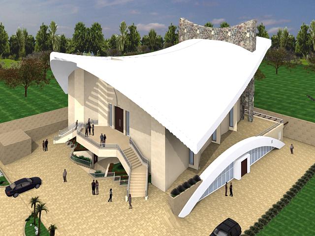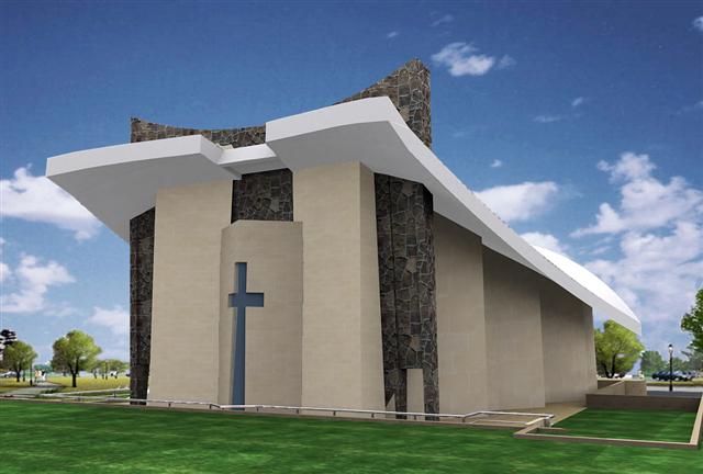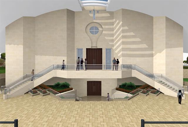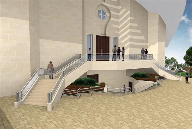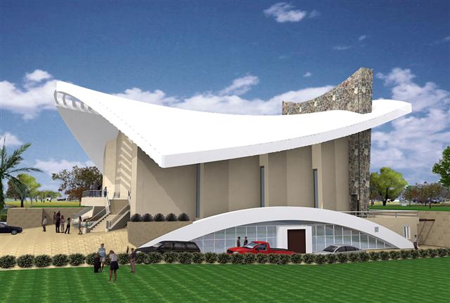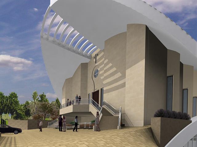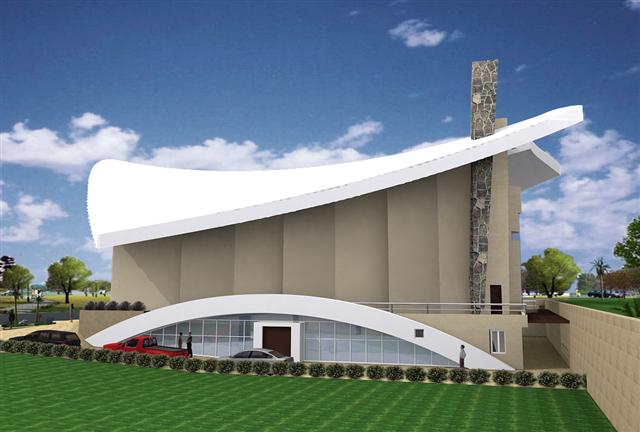 Special Architecture Theater - like shape dome structure with its deceiving exterior, which entrance seems narrow however while entering, the area broadens up directing to the altar. Built on the light concept (God is Light) with a unique ambiance created by the 14 meters height windows cross, which insinuate the vertical emphasis of the building. Created by the special finishing marble and wood from inside, stone and glass from outside. With a space for 700 parishioners, special place for praying and contemplating.
