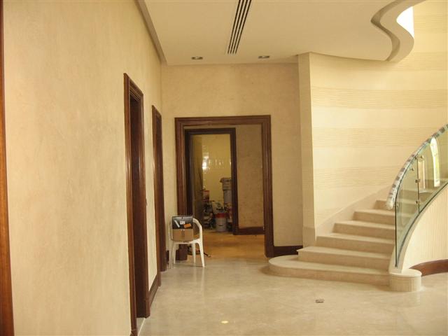 Luxury Villa that is distinctive with its round double height windows from the facade view which is actually an immense spiral staircase from inside so as to encompass of elegant marble material and simple yet stylish handrail design with glass railing. On top, a golden effect decorative paint that accentuates the area. Its interiors include of elaborate wooden works such as the bar, false ceiling beams, shelves, dressings and flooring as well. The lighten ambience of the villa is from its unadorned wall paints, whereas decorative paint are applied only in various areas so as to give a touch of intricacy, also the mellow lighting effect and marble floorings. Vast landscape around the villa is linked with pathways directing from a landscape feature to another such as fountain, deck area, pergola, Japanese garden, barbeque area in addition to the pleasing swimming pool. Overall bestows a tranquil mood.
